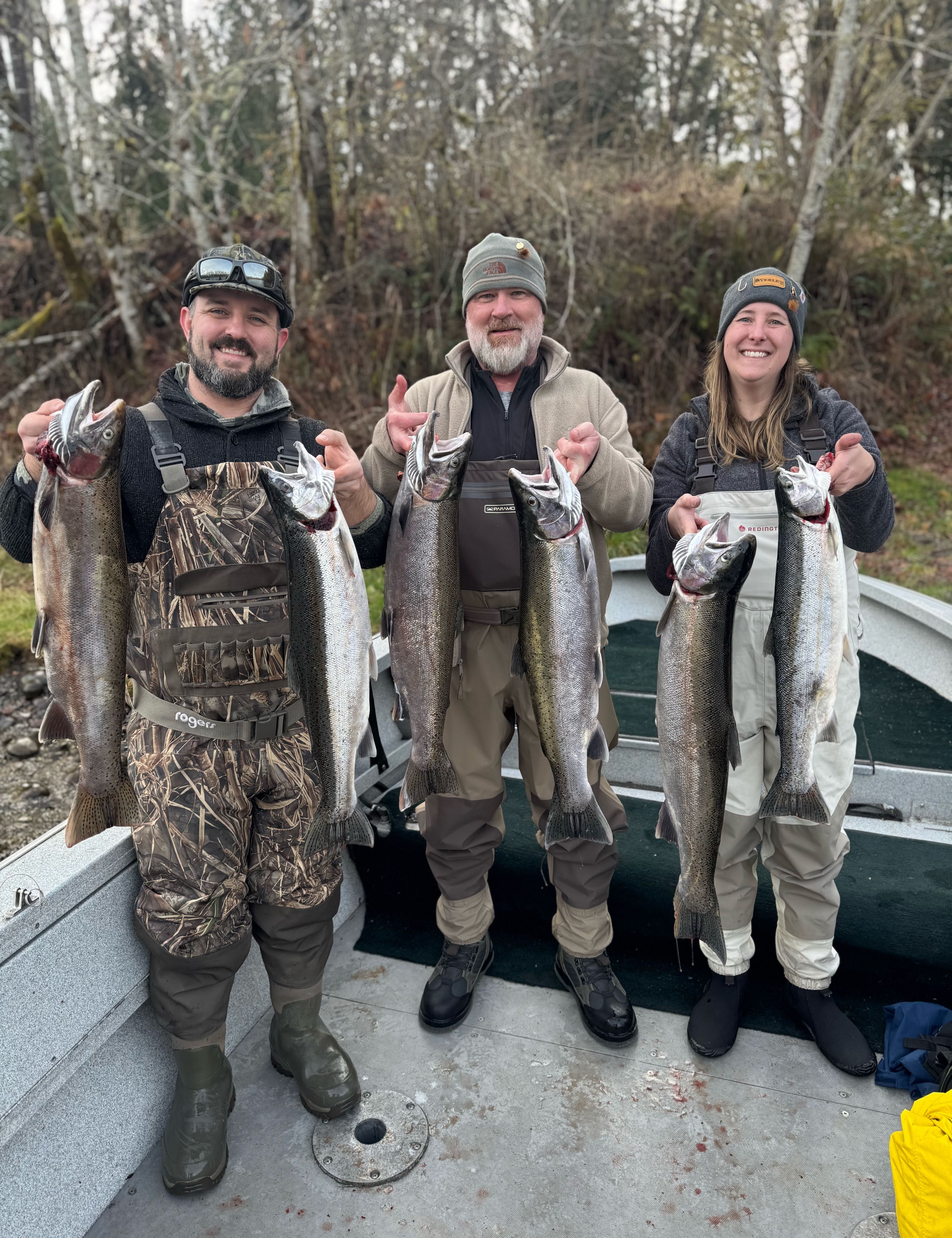 Every season brings its share of memorable fish, and this winter has been no exception. We've been seeing a solid run of steelhead, with quite a few in the 12-15 pound range. One of our guests last week battled a chrome-bright 18-pounder for nearly 20 minutes before we could slip the net under it. Another highlight was a double hookup that had both anglers scrambling to keep their lines clear while their steelhead did their best to tangle things up. Those are the moments that make winter steelheading so addictive.